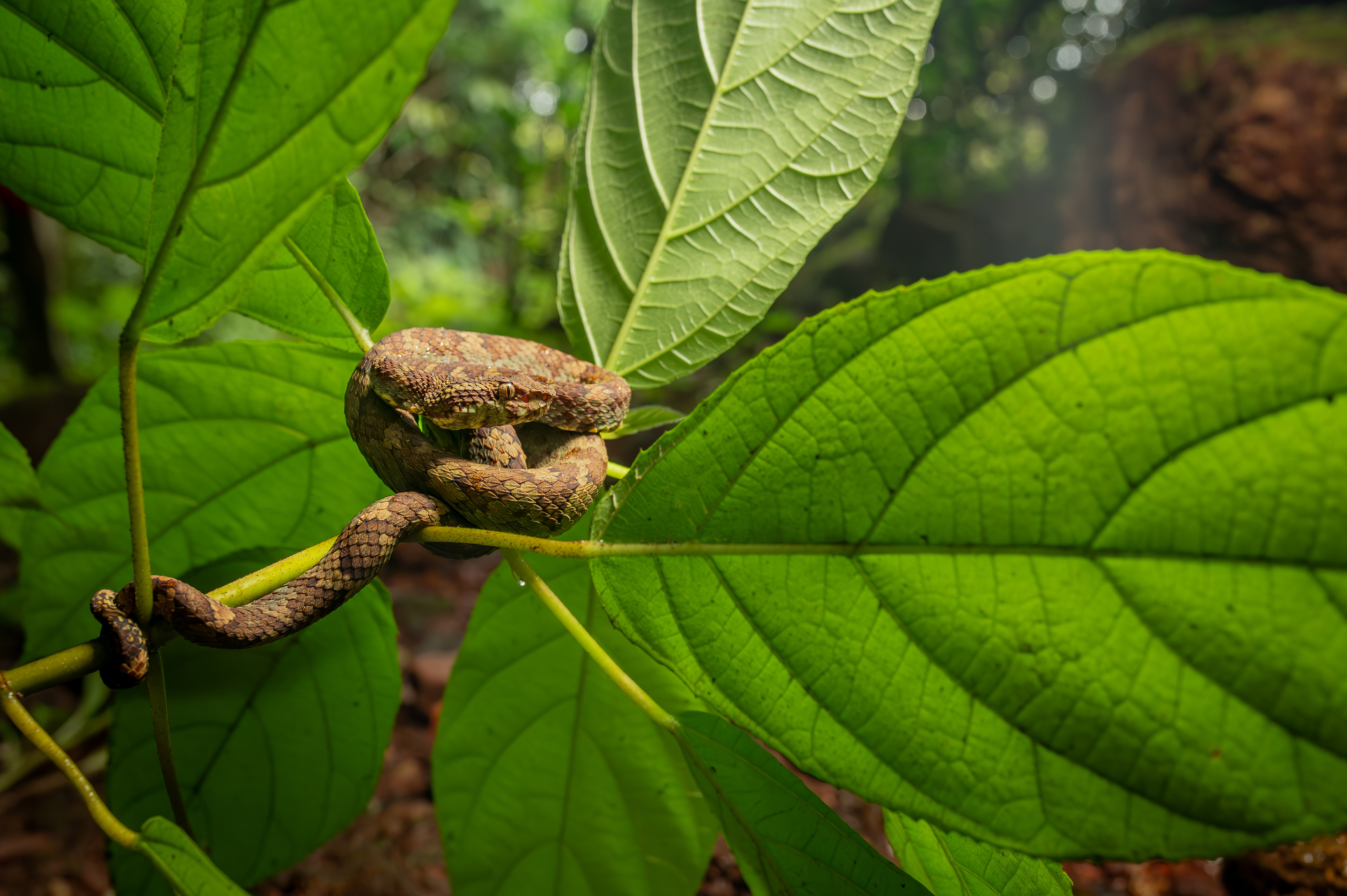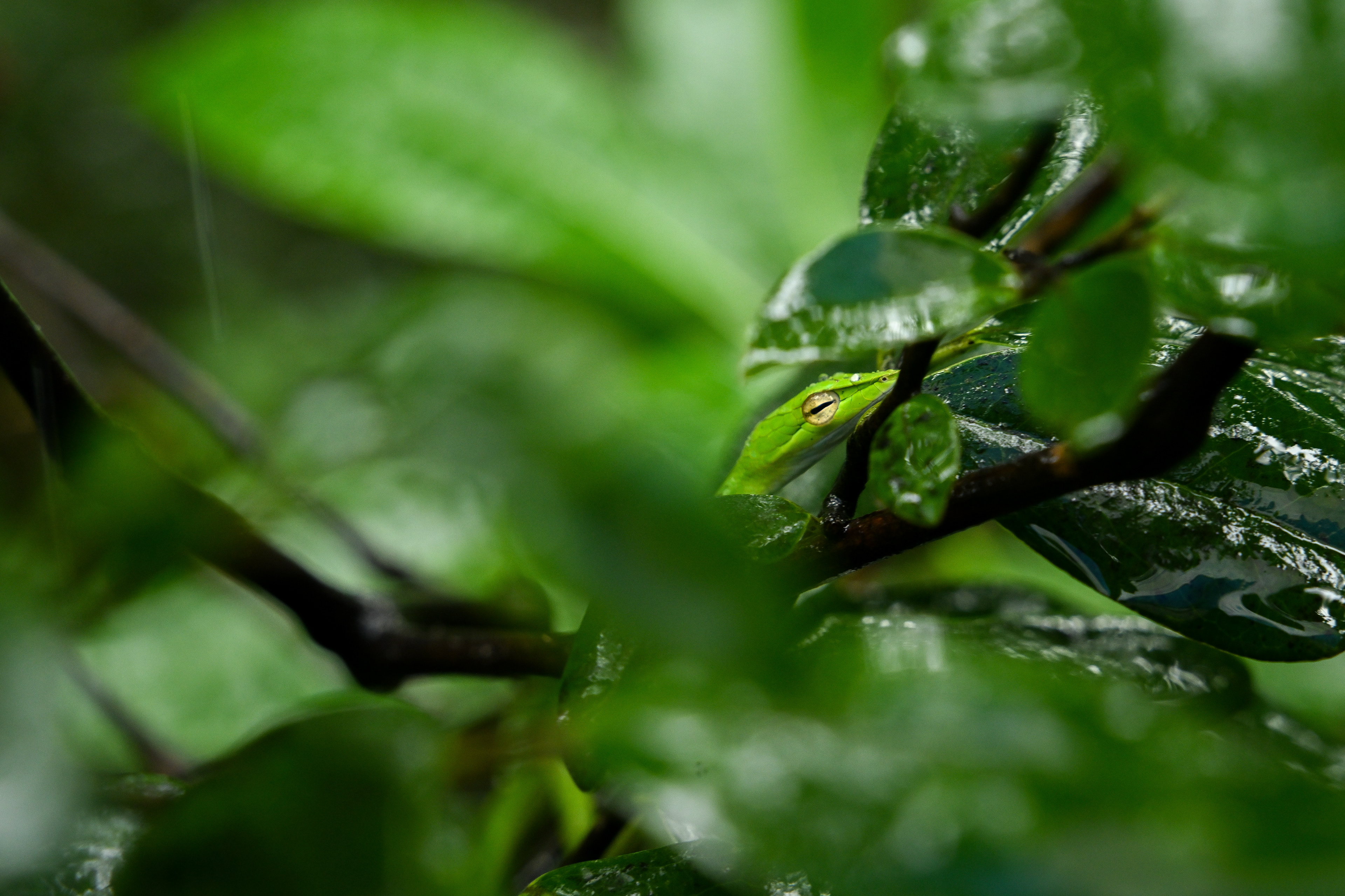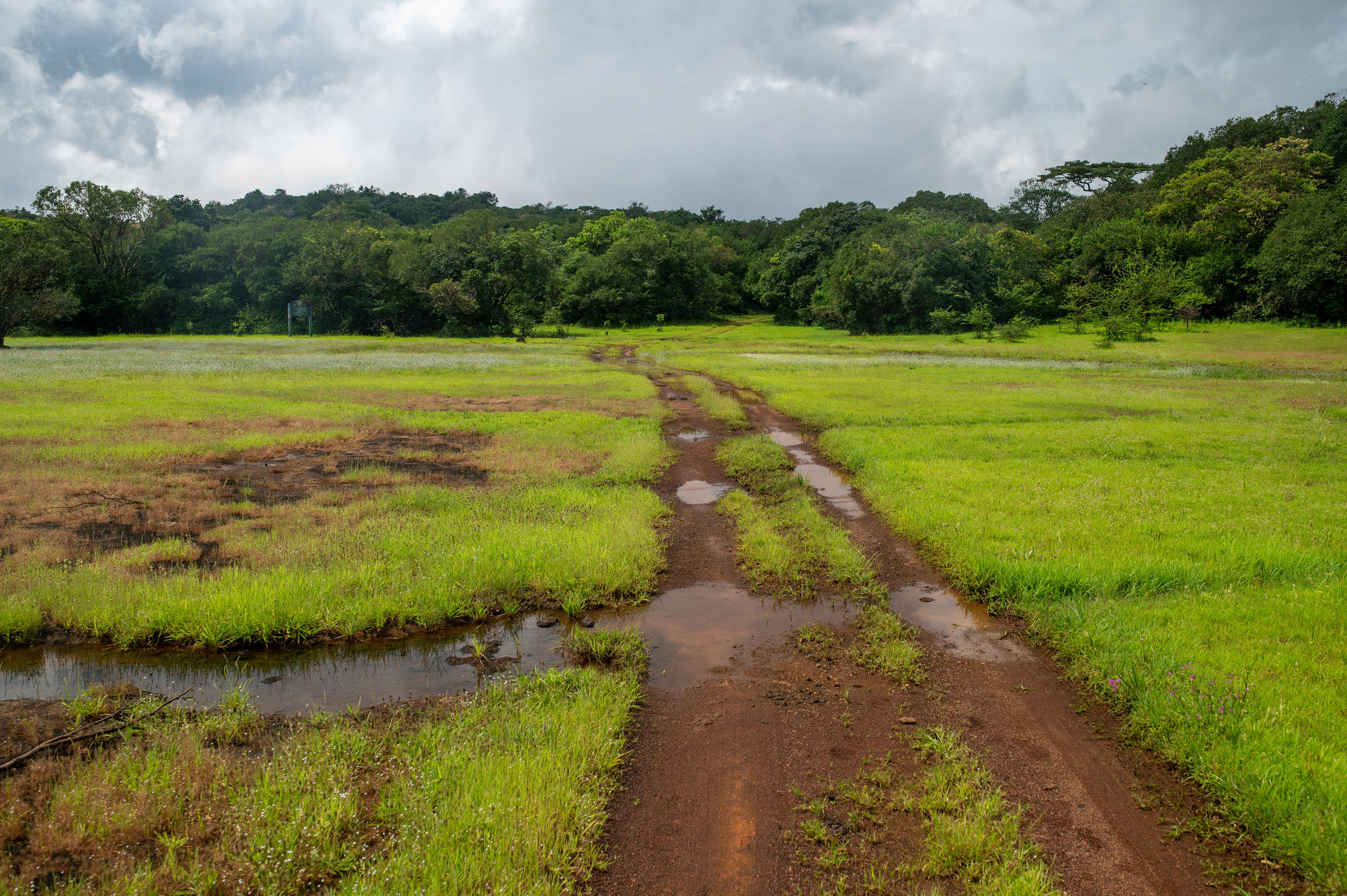 An hour-long drive into the heart of the thick rainforests of the Western Ghats from Bhimgad Nature Camp takes you through thick evergreen vegetation and the occasional shola grasslands. During the monsoons, the tyres of the 4x4 struggle, and getting stuck on the route must always be taken into account. Also, during this time of the year, the short bridge across the revered river Mhadayi is submerged. Mhadayi takes over the bridge in Bhimgad on her way to Mhadayi wildlife sanctuary in Goa, before draining into the Arabian Sea. Along the river, kingfishers hunt, keelbacks bask in attempts to catch whatever scarce sunlight there might be available, and gliding frogs lay eggs in pouches on leaves overhanging the flow of the river. On this drive, you see trogons and bulbuls, the occasional family of Chital running across the grasslands through the trees, and vine snakes & vipers perch on thin branches, waiting to ambush unsuspecting prey. If you’re lucky, you might catch a glimpse of a big cat. If you’re luckier even, a pack of Dholes. A visual overload of lush green and bright red soil, the sounds of constant rain and flowing water dominate the soundscape, with the frequent calls of over a hundred species of birds dominating the sensory experience.