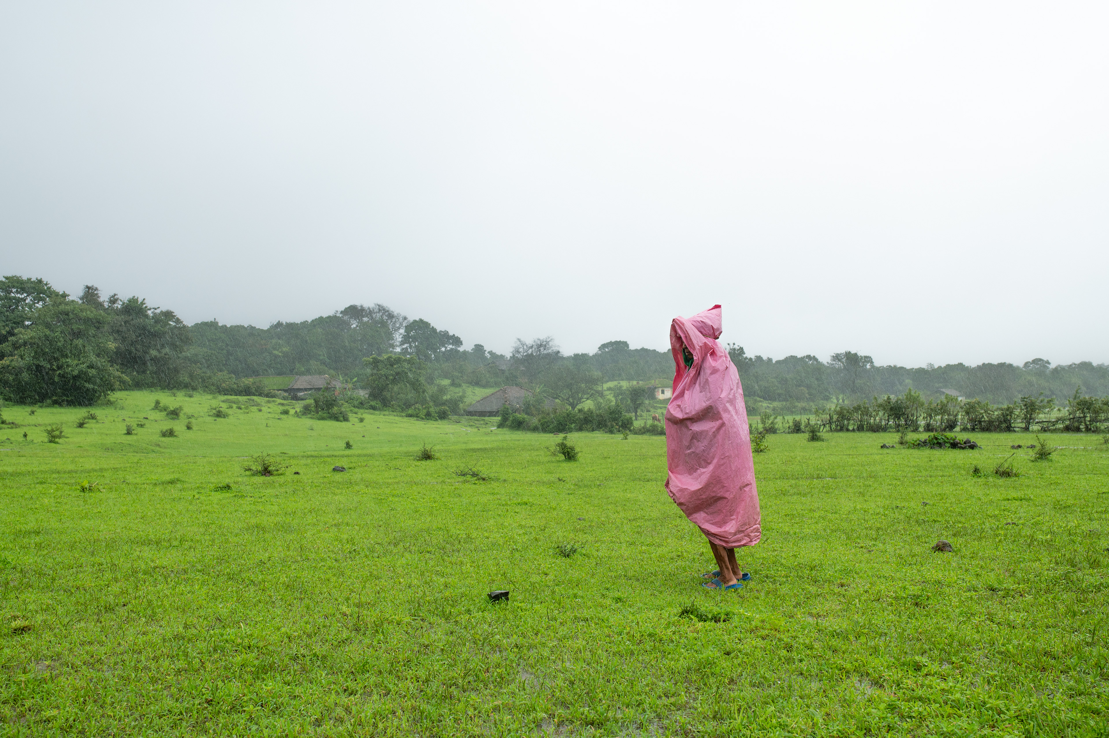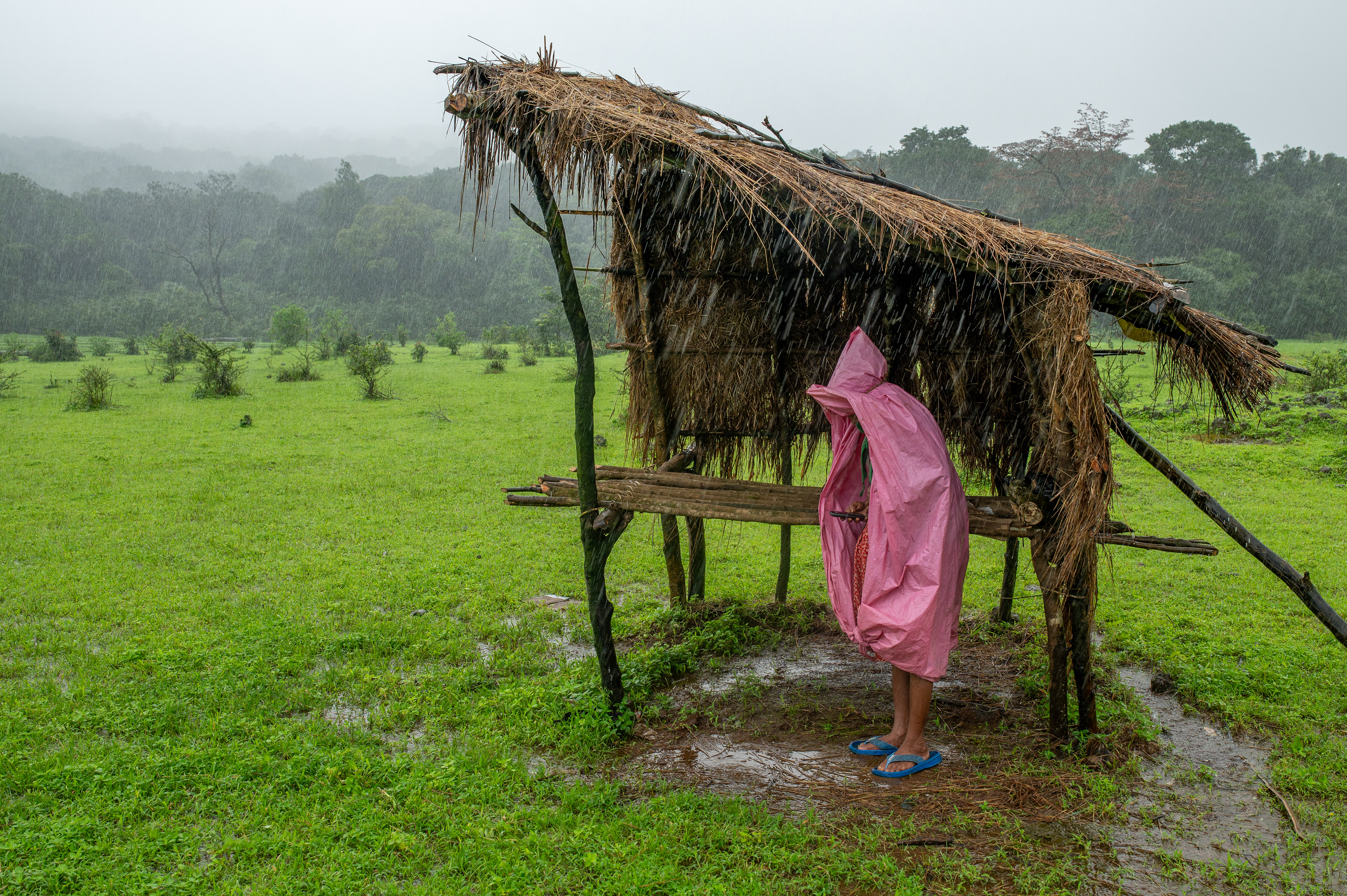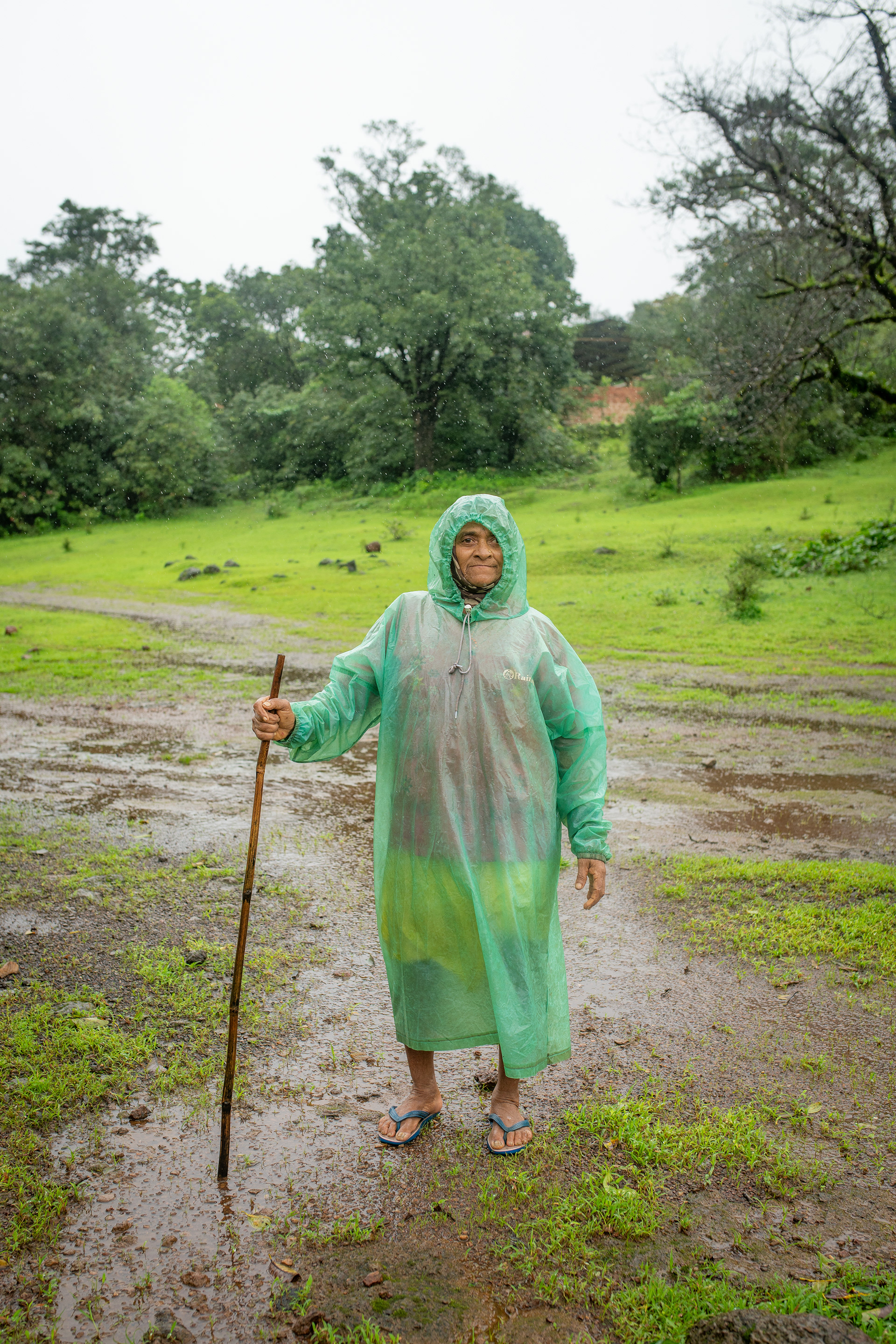 As I cleared my mind to be more present, I saw a figure moving, a person wearing a green poncho, arriving at the shed. Early in the morning, in the rain that would be classified as heavy in most places around the world but merely a drizzle for the residents, someone was already at work. I walked across to the shed and greeted the person. A wrinkled yet very warm face greeted me. This was Aarti Kaku, a sixty-year-old resident of Talewadi. The shed was her cow shed, where she housed her seven cows. She mentioned how she initially had eleven cows in this shed over the last couple of years, but four of them had been taken by Tigers and Leopards. She was out this morning to take the cows out to graze, as she does every day. Clearly, this was an ideal place for cows to graze. I didn’t think they’d ever run out of grass to eat. Aarti Kaku told me she had been doing this every single day of her life for decades, and it was a very integral part of who she is. Most curious about the rain, I asked her if she was at all fazed by the constant pouring down. “Savay zhaali ahe ata. Changla vatta,” (It has become a habit. The rain feels good.) she calmly answered. “Kasa pan, haa pawsala amcha ithla shevat cha.” (Anyway, this monsoon is our last one here.)