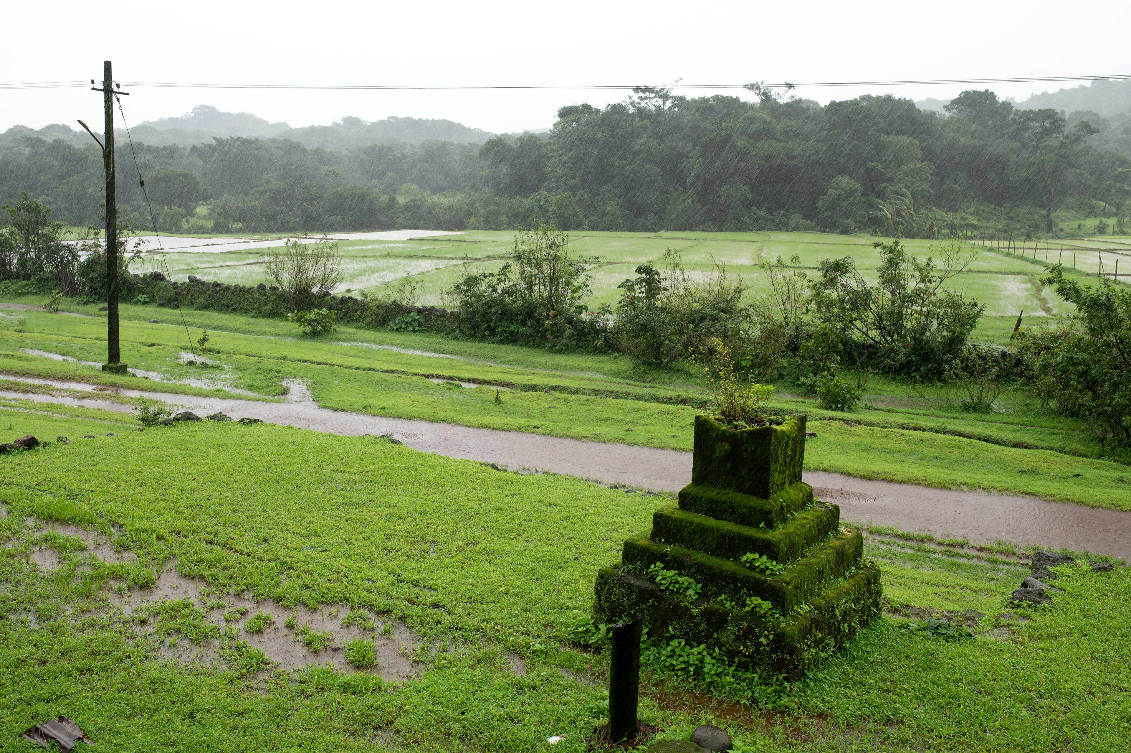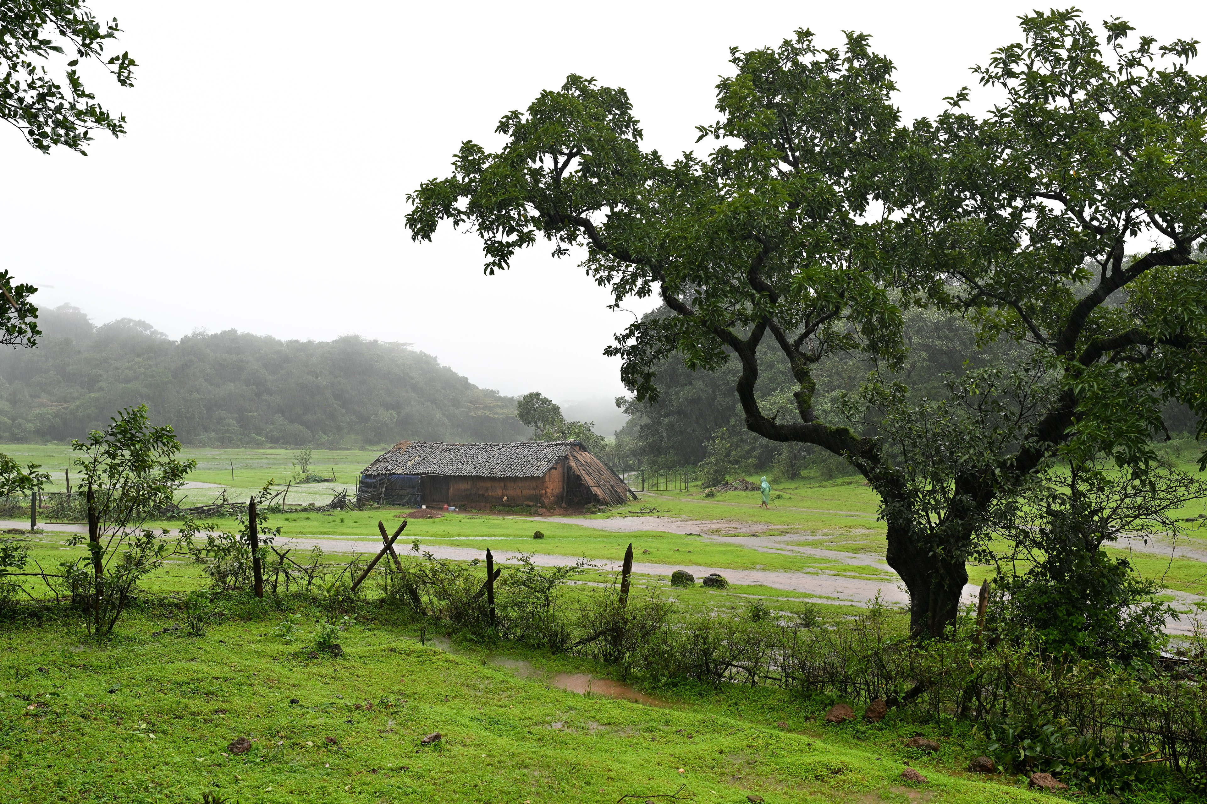 A lush, green landscape stood before me. This was my first visit to Bhimgad Wildlife Sanctuary in July, during the peak of the monsoon season. We had arrived after sunset the previous evening, so this was my first glimpse of the landscape. The ground was wet from the rain of the last two months. Puddles formed everywhere, and the air carried a hint of the pleasant petrichor of the Western Ghats’ red soil. An old but robust shed sat right across from the fence of the APC. Behind the shed, lay a short expanse of paddy fields. A vast expanse of tropical evergreen rainforest surrounded the shed, the fields, and the APC I was observing from. People described this place as one where the rain never stopped during the monsoon months. It varied in intensity, but at any given point in time, there would be a drizzle, at the very least. Parts of the sanctuary consistently receive over 10,000mm (400 in) of annual rainfall every year (Deccan Herald 2012). Being here reminded me of Tumbbad, a small fictional village of a similar size located in the Western Ghats of Maharashtra, not too far from here, in the cult-horror movie of the same name by Rahi Anil Barve & Anand Gandhi. The village in the film is described as having the wrath of the gods rain down upon the land in perpetuity. While the mythological element did not exist here, looking across at the shed in the rainforest evoked this cinematic imagery in my mind.