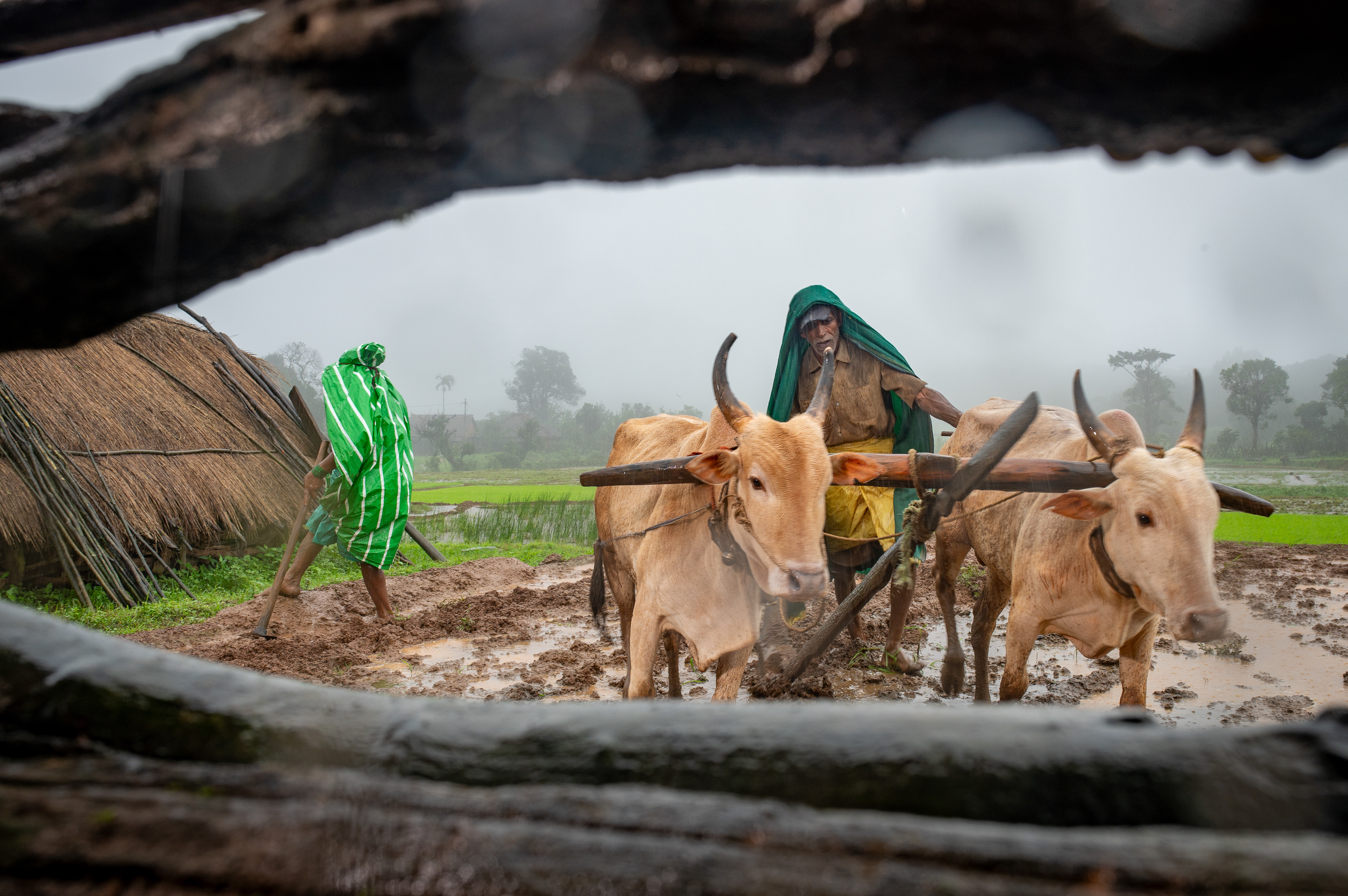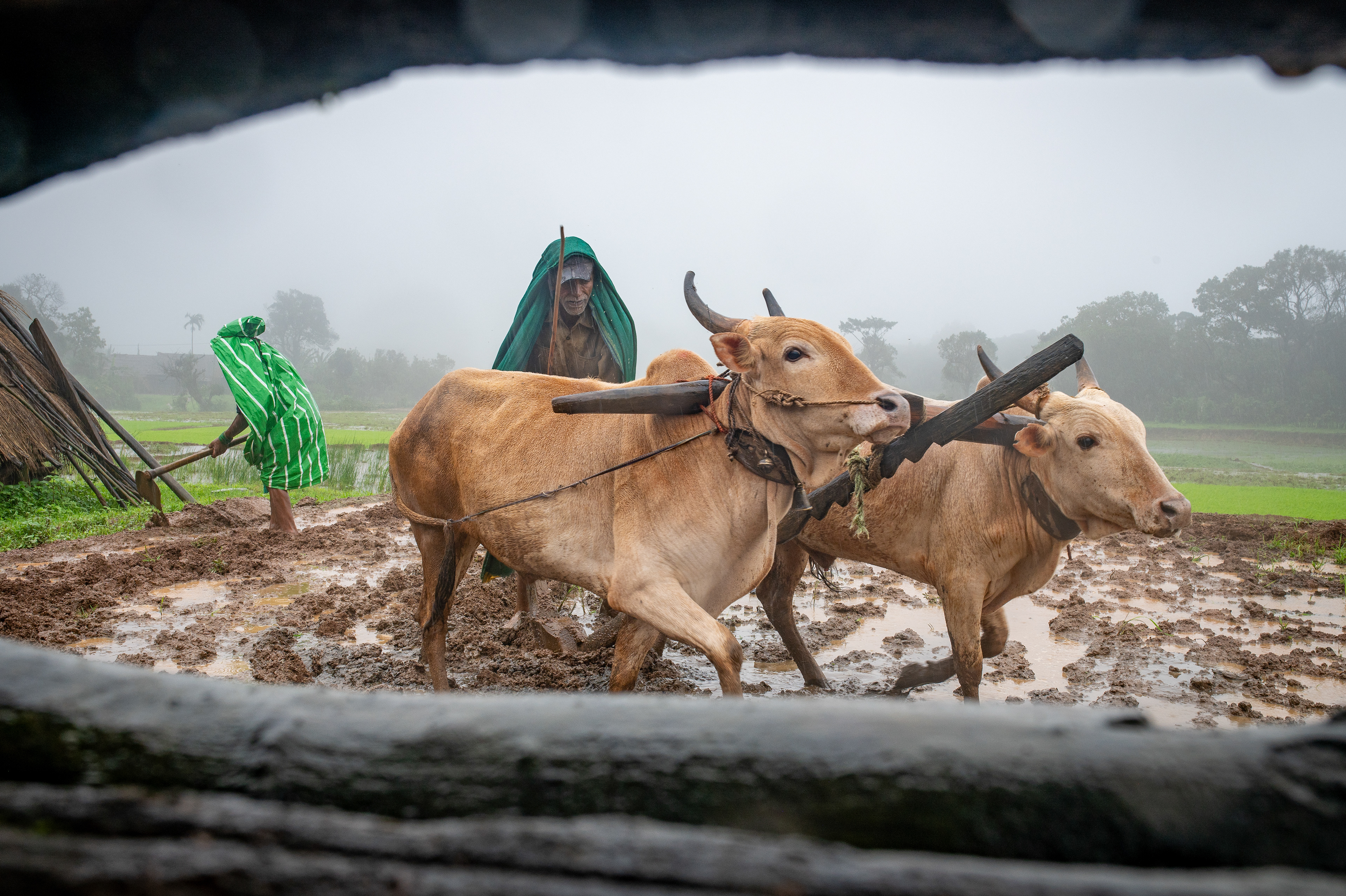 Aarti Kaku (in a green poncho) walks along her Cowshed, the paddy fields, and the rainforest.