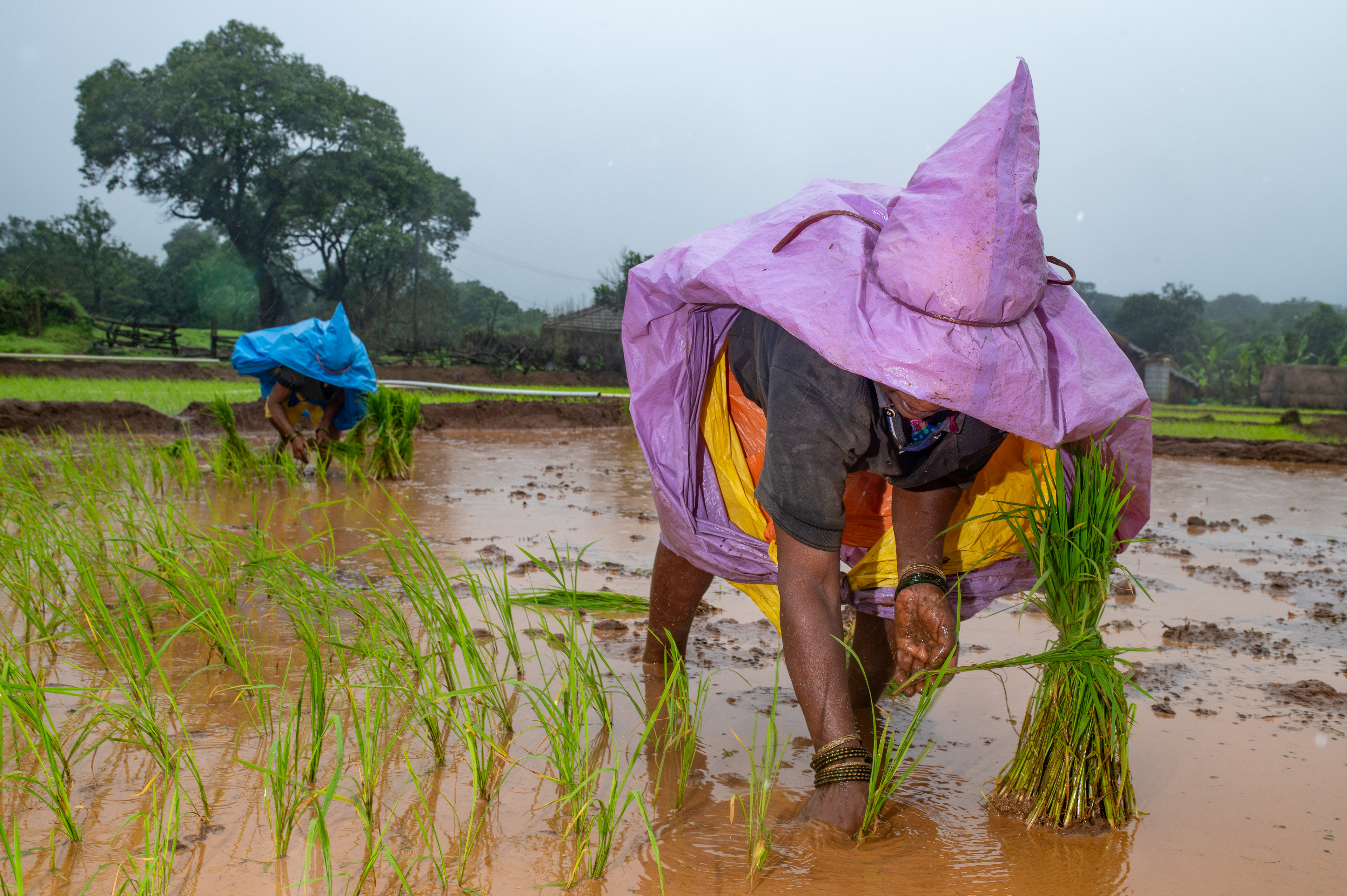 Soham Mama, Krishna Mama’s younger brother, and his wife, Kamla Mami, prepared a plot of land by ploughing the field, while a bunch of other women transplanted young paddy splings onto already-ploughed land. I walked down to join the women, wading into the waterlogged field, where I instantly found myself shin-deep in mud, as the rain poured down on us. Initially taken aback, the women slowly warmed up to me as I spoke with them in Marathi, while I worked my hands simultaneously. I asked them to teach me how to plant these rice stalks in the ground, but the soil was so loose from all the water that you couldn’t even see it in the mucky waterlogging. They guided me patiently as I began to catch the hang of it.