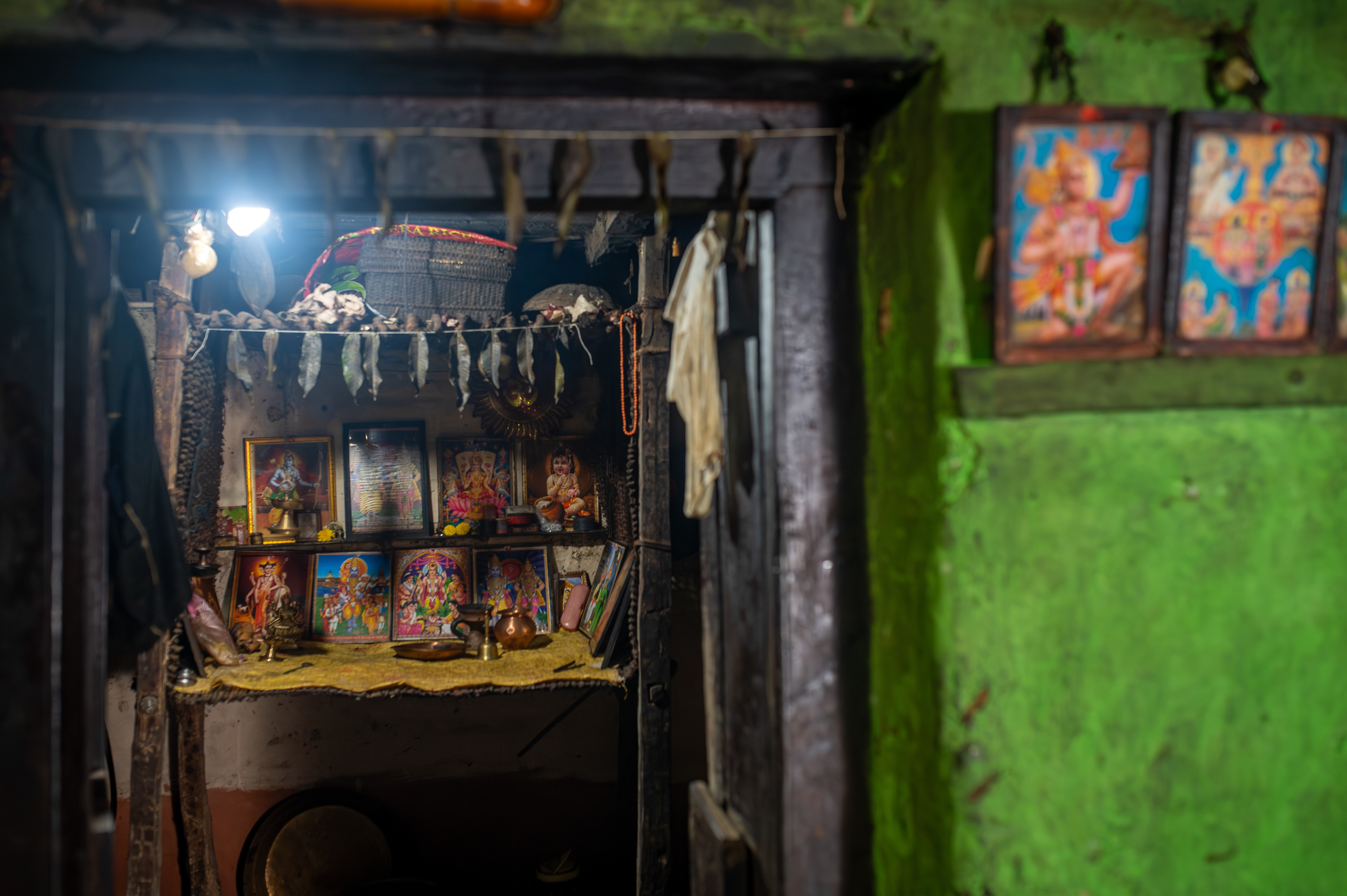 The temple inside Krishna Mama’s house, lined with photographs of Hindu Deities. The wall outside is also lined with photographs of other deities.